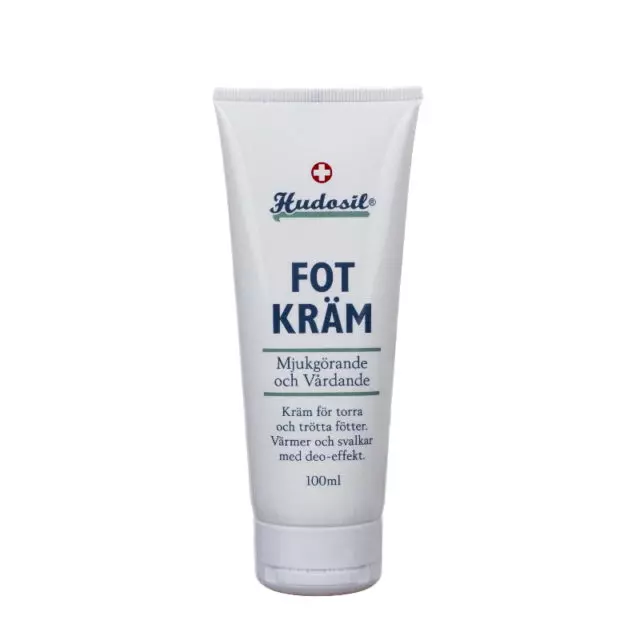 Odżywczy rozgrzewająco-chłodzący krem do stóp Hudosil Fotkräm przeznaczony do pielęgnacji suchych i zmęczonych stóp. Zawiera dużą ilość substancji natłuszczających i nawilżających. Krem do stóp rozgrzewa i chłodzi po nałożeniu. Dzięki obecności kamfory rozgrzewa i poprawia mikrokrążenie, natomiast mentol i olejek z mięty pieprzowej mają właściwości chłodzące i odświeżające. Przyjemnie pachnie niektórymi substancjami aktywnymi.