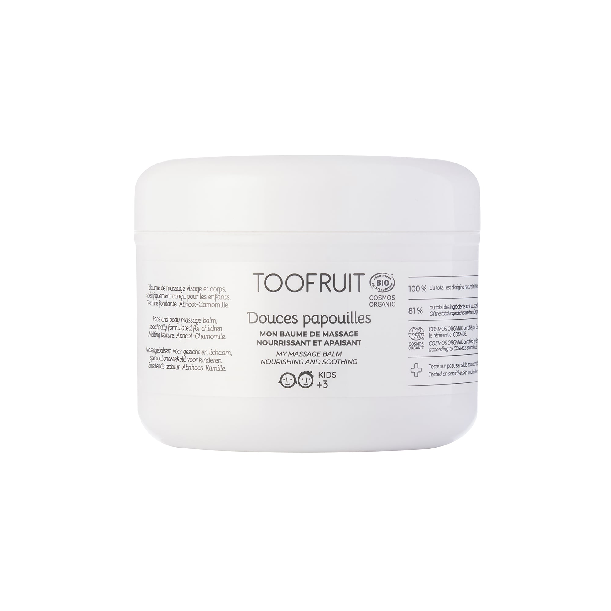 Odżywczy balsam do masażu ciała dla dzieci. MORELA - RUMIANEK. Stworzony z myślą o dzieciach certyfikowany, organiczny balsam do masażu. Rozpływająca się konsystencja wzbogacona o masło shea, olej kokoksowy i olej z moreli, pozwala odżywić wrażliwą skórę dziecka. Rumianek wycisza i uspokaja. My Massage Balm został opracowany do stosowania podczas, specjalnego 30-minutowego masażu dedykowanego dzieciom. Ze względów praktycznych opracowaliśmy balsam, nie olejek, ponieważ dzieci często poruszają się podczas masażu. Po podgrzaniu balsam staje się niemal płynny, zapewniając doskonałą bazę dla przyjemnego, wyciszającego masażu. Sposób użycia: Nałóż odrobinę balsamu, rozgrzej go w dłoniach i rozprowadź po całym ciele okrężnymi ruchami. Jak to działa? - Organiczny olej morelowy, bogaty w kwasy oleinowe, ma właściwości zmiękczające oraz zapewnia silny poślizg. - Oleista maceracja rumianku ma właściwości kojące i zmiękczające. Sprzyja wyciszeniu i zasypianiu. - Wosk Carnauba zmiękcza i tworzy film na skórze. - Wosk Candelilla ma doskonałe właściwości filmotwórcze, stabilizujące i zagęszczające. - Organiczny olej kokosowy jest bogaty w kwasy tłuszczowe, zwłaszcza kwas laurynowy. Ma właściwości nawilżające, odżywcze i właściwości zmiękczające. - Organiczne masło shea, bogate w witaminy, chroni, zmiękcza i odbudowuje zniszczoną skórę. - Organiczny olej słonecznikowy, bogaty w witaminę E i kwasy omega 6, ma właściwości nawilżające, odżywcze i przeciwutleniające. - Wosk ze skórki owocu lakownicy japońskiej jest woskiem roślinnym stosowanym jako wegański zagęszczacz. 100% SKŁADNIKÓW JEST POCHODZENIA NATURALNEGO 81,2% SKŁADNIKÓW POCHODZI Z UPRAW EKOLOGICZNYCH Efekt: Skóra jest nawilżona i odżywiona. Otula ją słodki zapach moreli, a rumianek wycisza. Rekomendacja dla dzieci powyżej 3 roku życia. Produkt do użytku profesjonalnego.