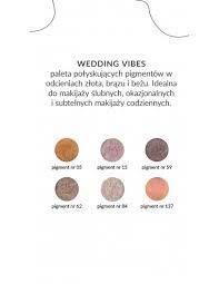 WEDDING VIBES to paleta w odcieniach złota, brązu i beżu z delikatnie połyskującymi pigmentami mineralnymi, którymi można wykonać elegancki i kobiecy makijaż oka. Idealnie sprawdzi się do makijaży ślubnych i okazjonalnych, ale też subtelnych makijaży codziennych.